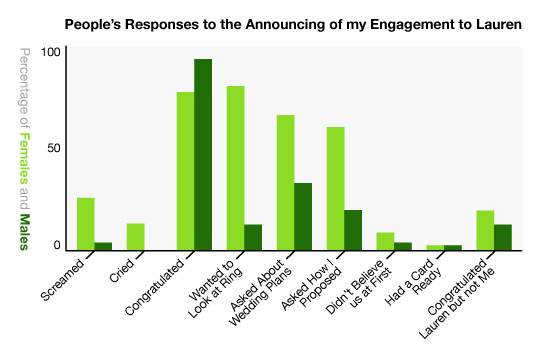 Last weekend I did possibly the most exciting thing I've ever done to date: Commit myself to one girl for the rest of my life, and then ask her to do the same. As this is some of the biggest news you can impart to others, my fiancée and I found it rather fun and interesting to see how people responded to our special announcement. The following is a graph showing some of these responses, however the data included is derived from memory only so don't base any thesis on this.
